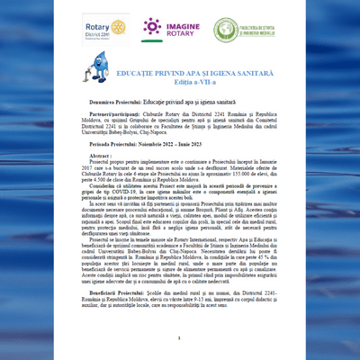 Vă invit să vă alăturați și în acest an Proiectului Districtual ''Educația privind apa și igiena sanitară", pentru a continua misiunea de educare a tinerilor prin mișcarea rotariană din cele două țări surori, România și Republica Moldova.